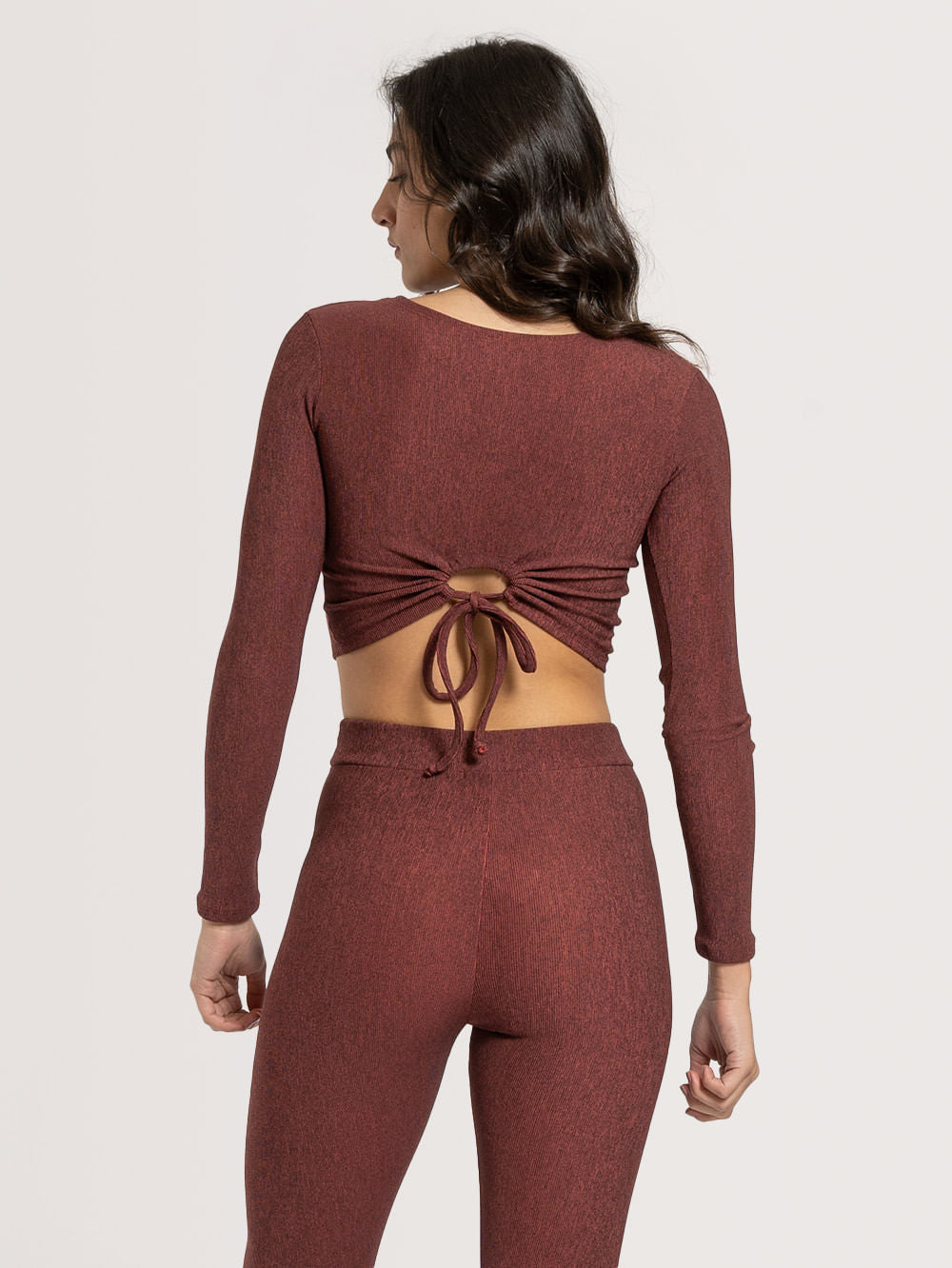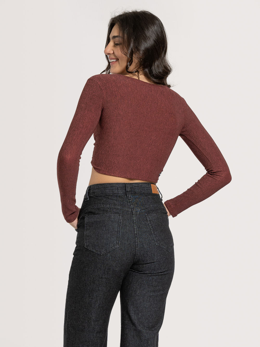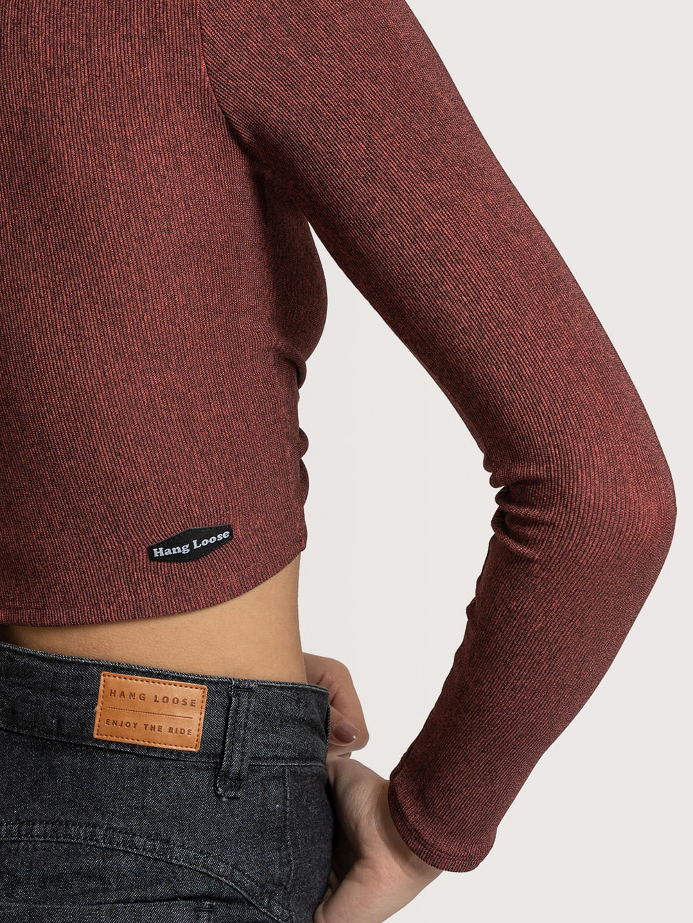 Blusa Hang Loose Hotoman Hang, possui manga longa, recortes e amarração que pode ser usada na frente e nas costas. Confeccionada em tecido poliéster e elastano.