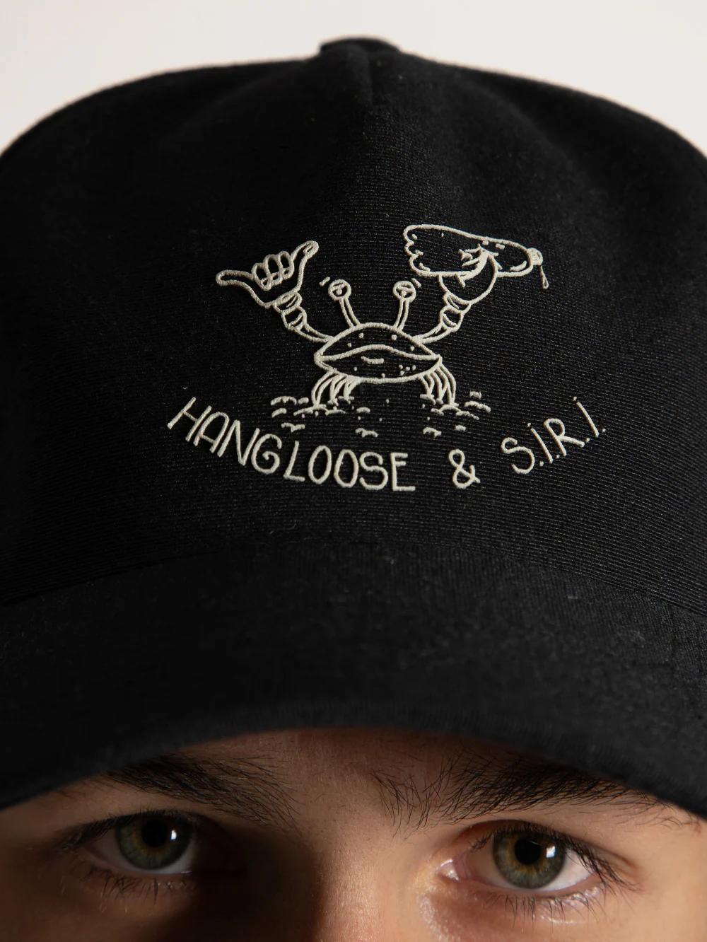 Boné feito com tecido sustentável proveniente de garrafa PET na cor preta, com estampa off-white alinhada à cartela de cores da família, à base d'água, um processo que agride bem menos o meio ambiente.
