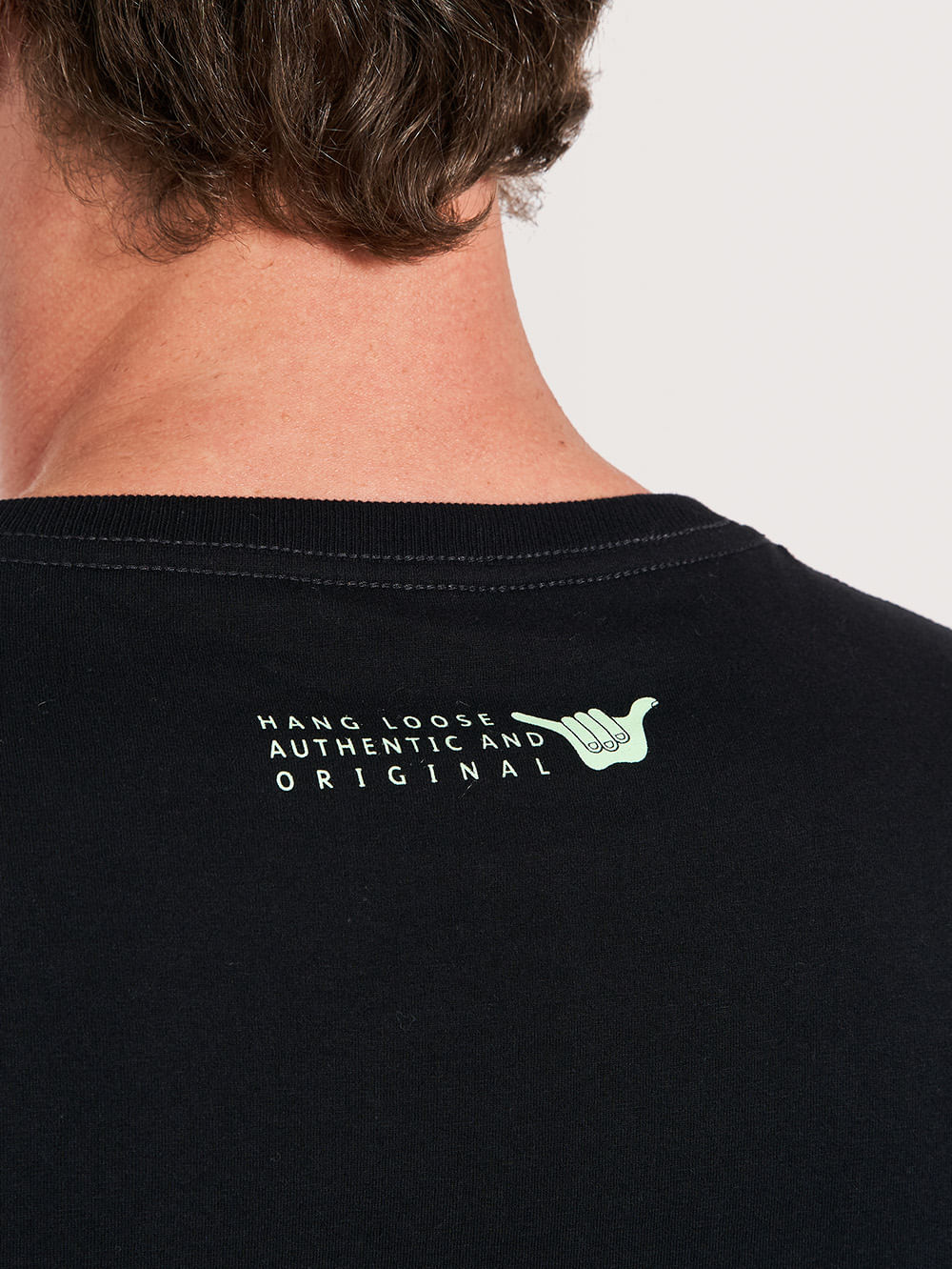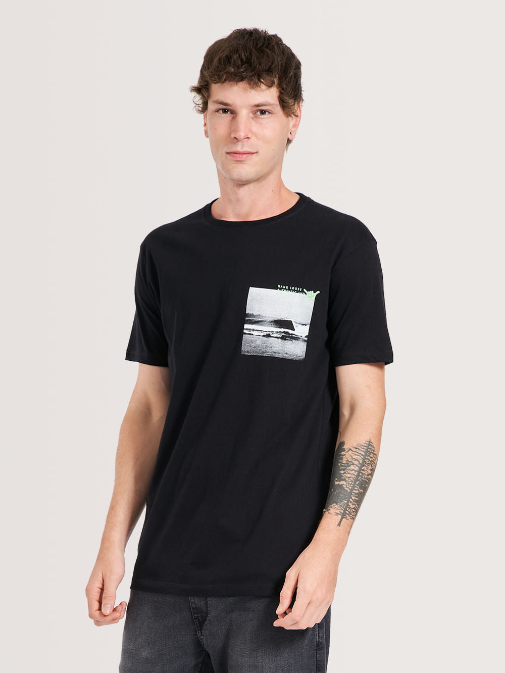 Camiseta Hang Loose Blacks, possui estampa em silk frontal e nuca e etiqueta Hang Loose aplicada na lateral. Confeccionada em tecido algodão.