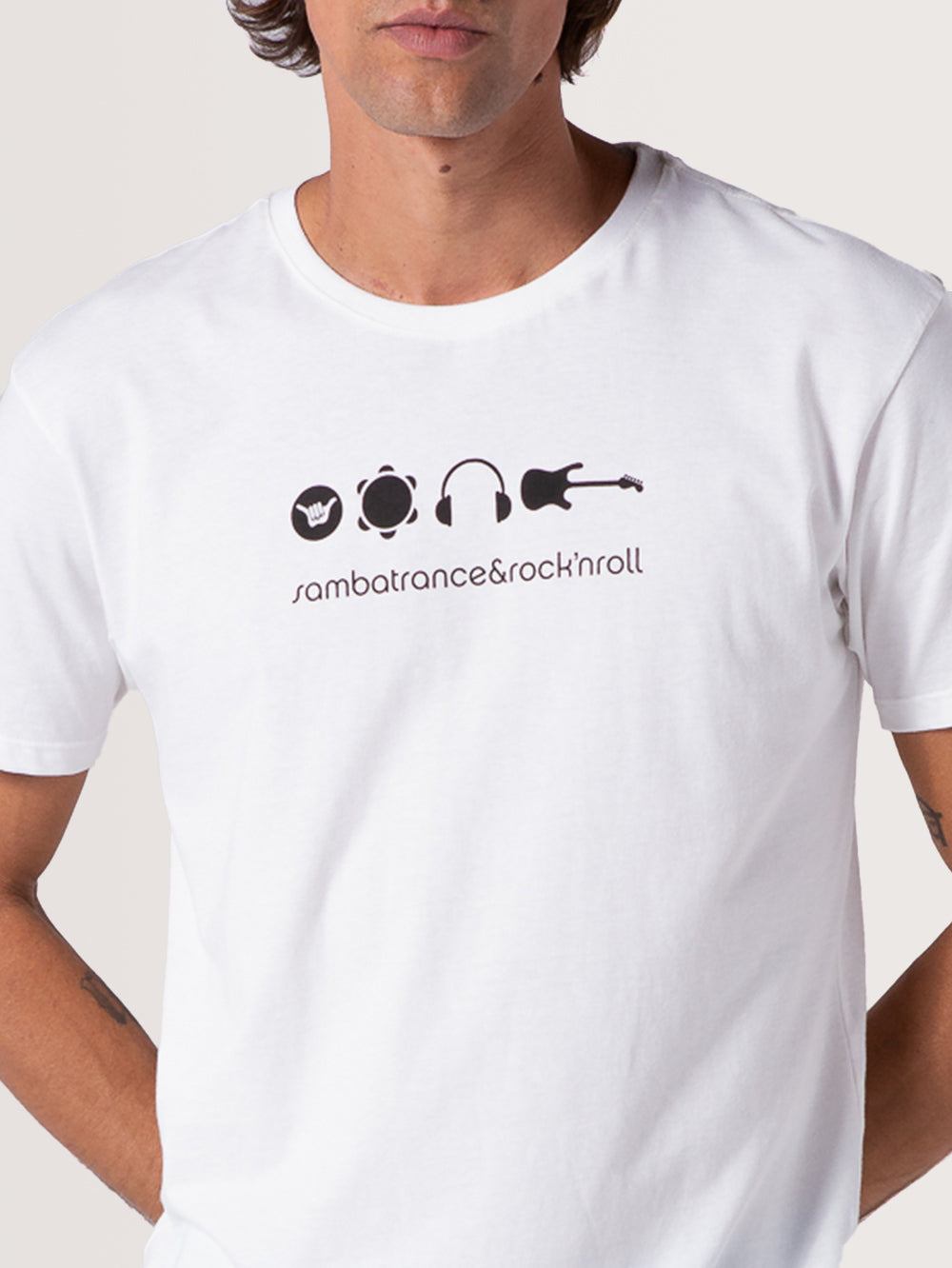 Camiseta Hang Loose Samba Trance. Possui print interno e estampa em silk frontal e nas costas.