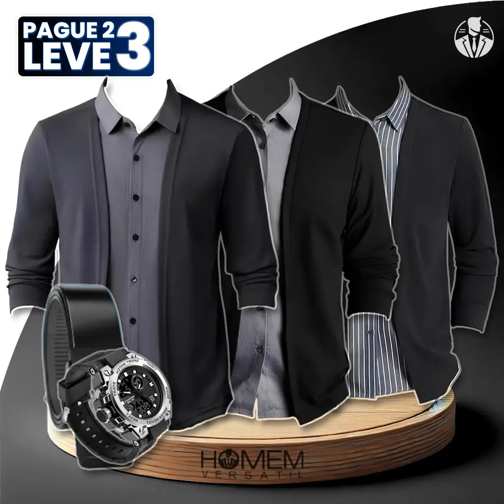 Não é só sobre vestir bem. É sobre passar presença. Essa camisa 2 em 1 junta visual de peso com praticidade bruta: parece sobreposição, mas é uma peça só. Ombros retos, peito desenhado e aquela postura que mostra que você não tá ali de brincadeira. Vestiu, encaixou, impôs. É isso.