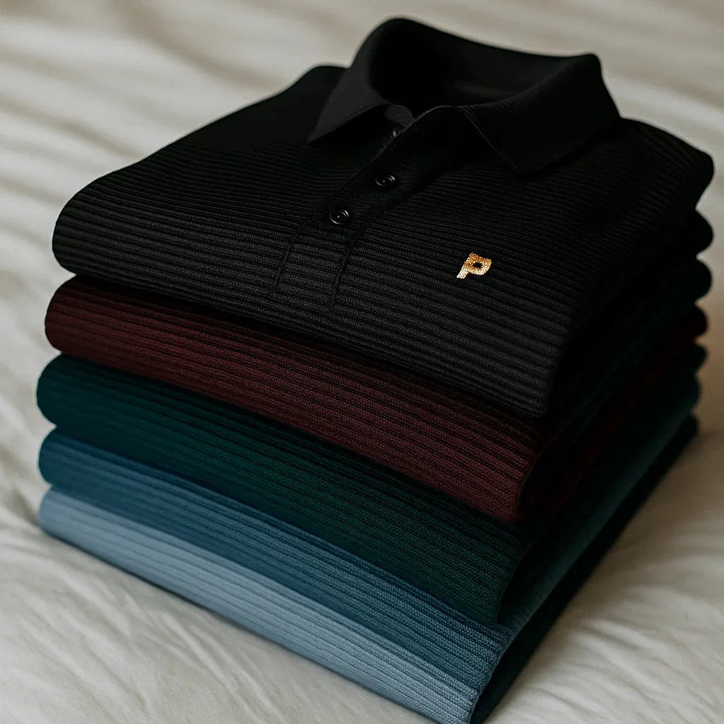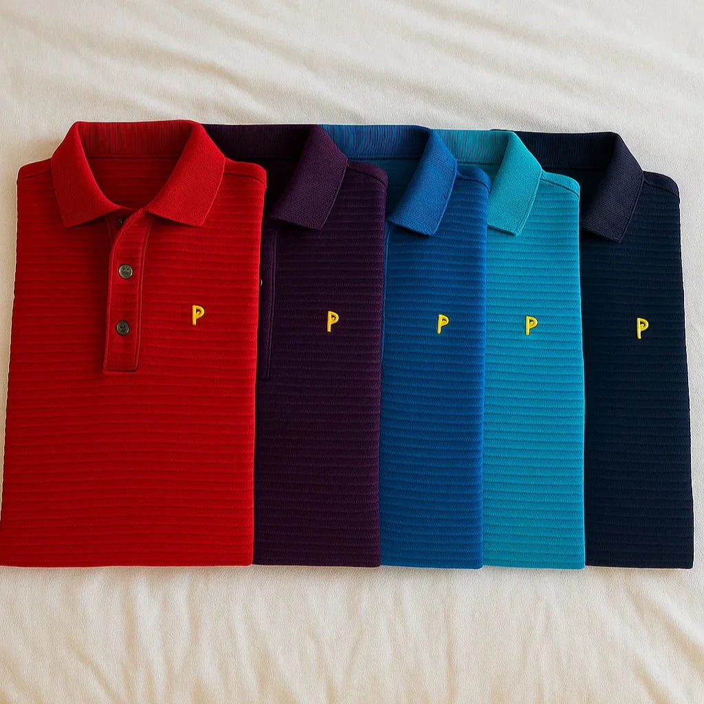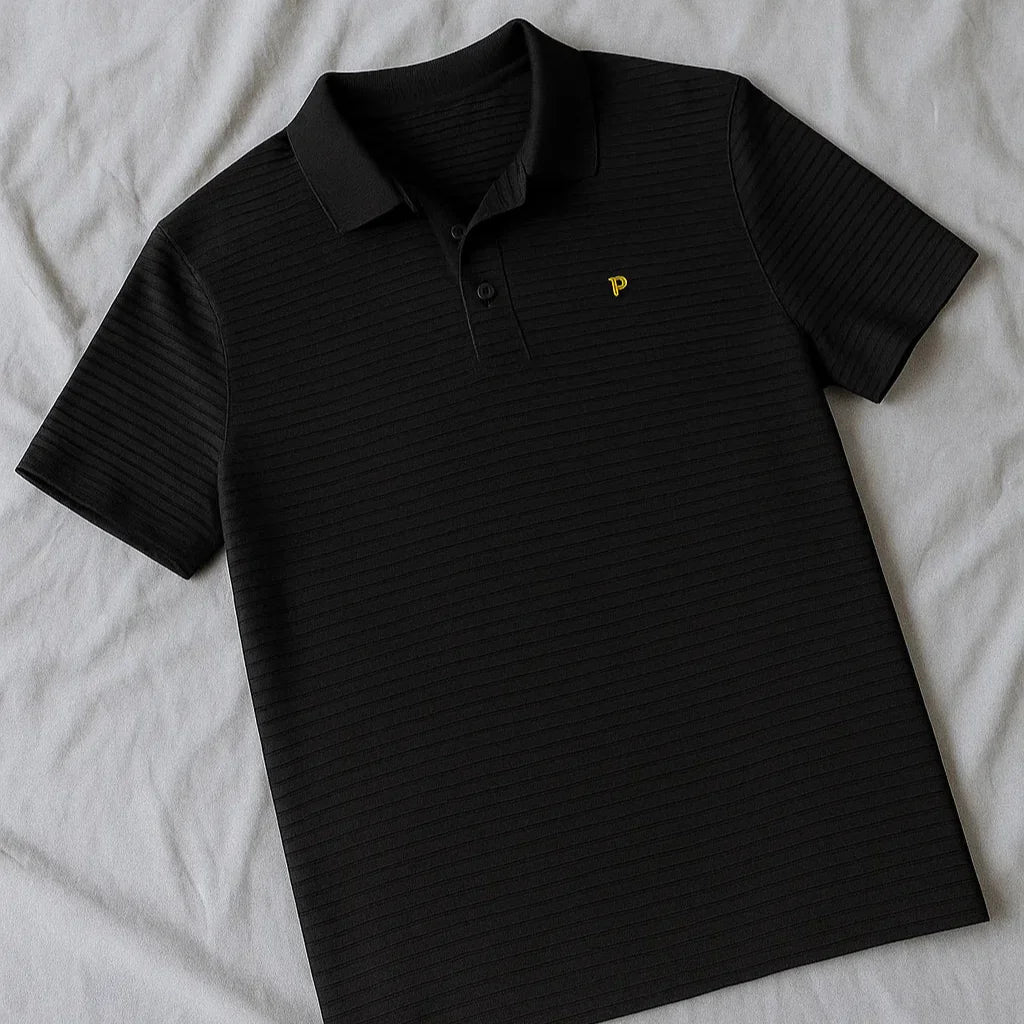Não é qualquer polo. Aqui é Camisa Polo Masculina Listrada Cardin de Manga Curta, feita com Seda Gelada, Poliuretano e Spandex. Ajuste brutal, caimento de presença, tecido gelado no corpo e design listrado que mostra quem está no comando. Sinta a diferença de vestir autoridade de verdade — peça feita pra homem que faz acontecer.