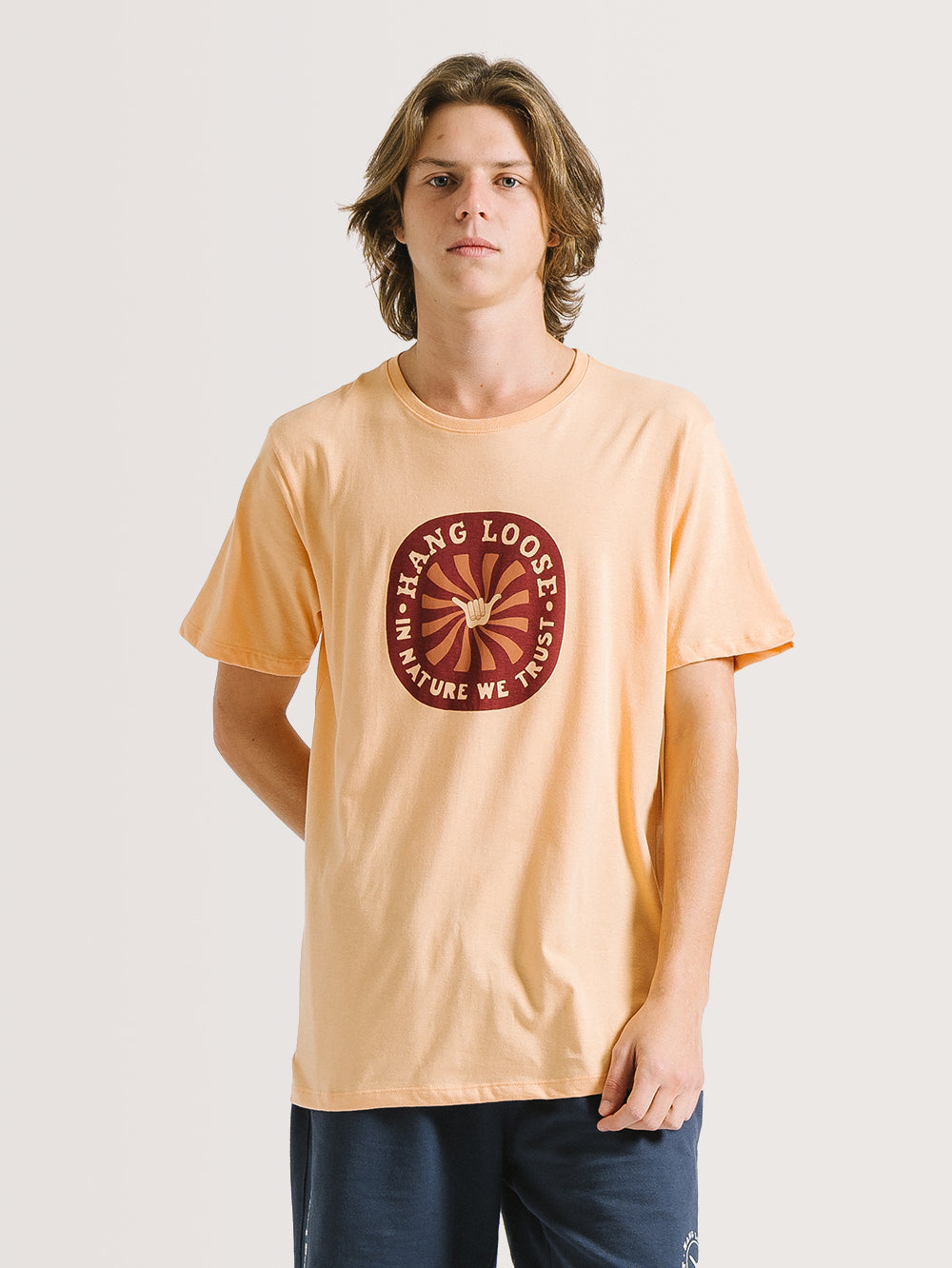 Camiseta Hang Loose Hypno, possui estampa em silk frontal e na nuca e etiquetas Hang Loose. Confeccionada em tecido meia malha 30/1.