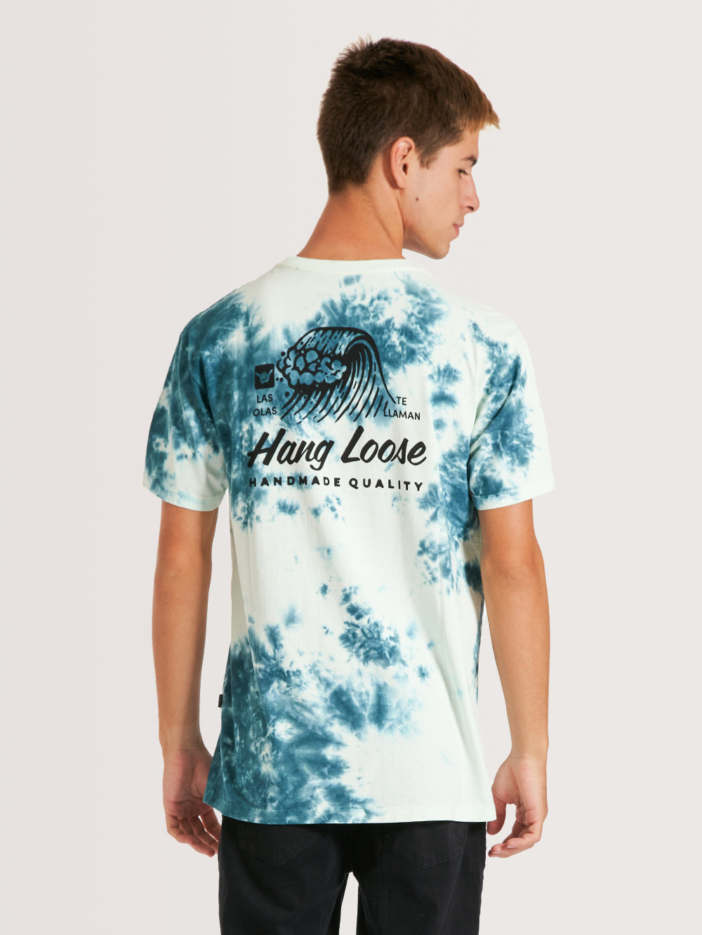 Camiseta Hang Loose Laola, possui estampa em silk frontal e nas costas e etiqueta Hang Loose na lateral. Confeccionada em tecido meia malha 30/1 tie dye.