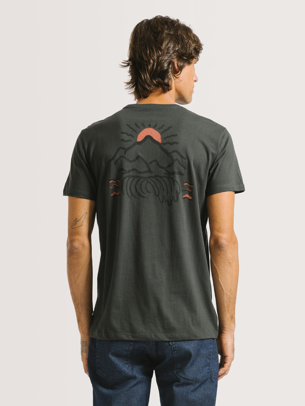 Camiseta Hang Loose Mountain, possui estampa em silk frontal e nas costas e etiquetas Hang Loose. Confeccionada em tecido meia malha 30/1.