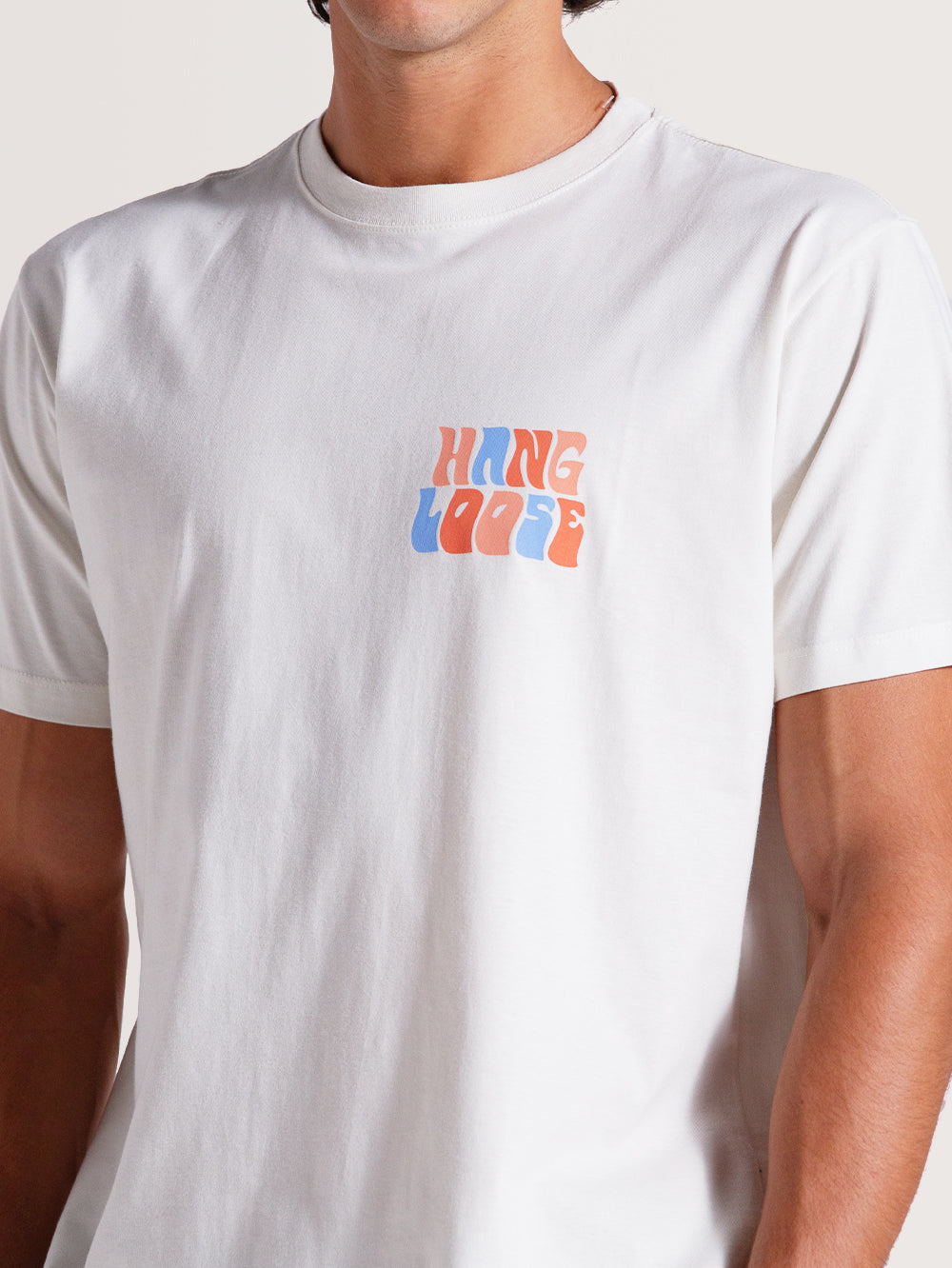 A camiseta masculina off white Hippie da Hang Loose é perfeita para o seu dia a dia. Sinta o conforto e maciez da malha de algodão dessa camiseta de manga curta masculina.