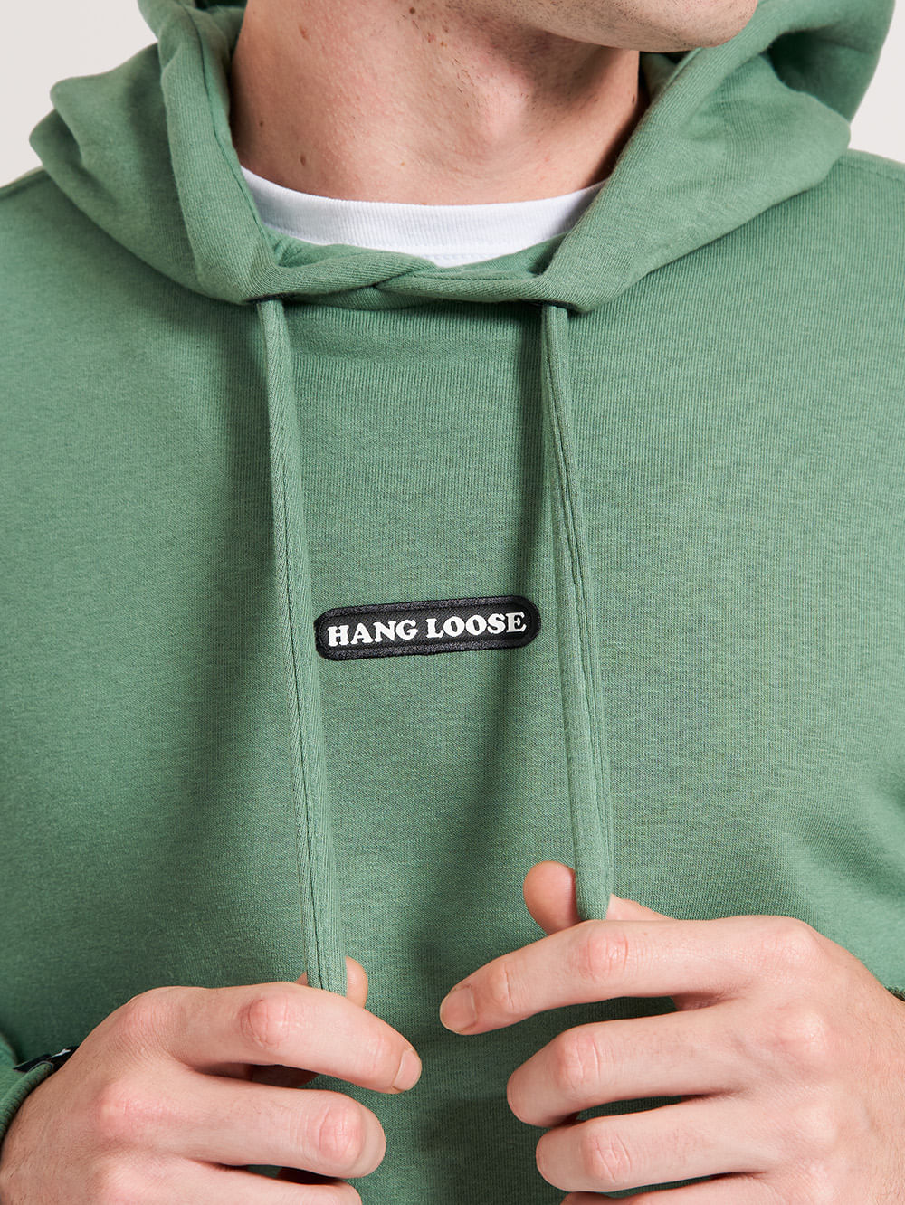 Moletom Canguru Hang Loose Low, possui capuz, bolso canguru, aplicação de patch frontal, ilhós e ponteira personalizada, aplicação de etiqueta nas costas, estampa em silk na manga e no capuz e etiquetas Hang Loose.