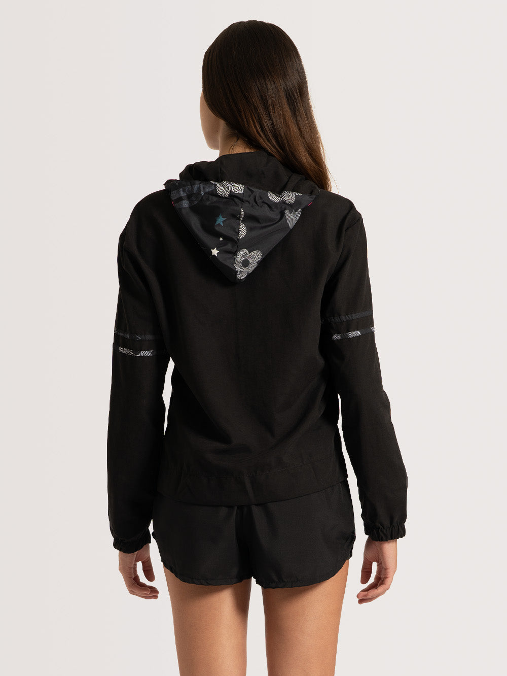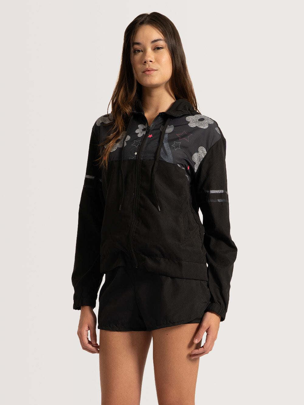 - Estampa Flower no capuz, nas faixas das mangas e no recorte frontal