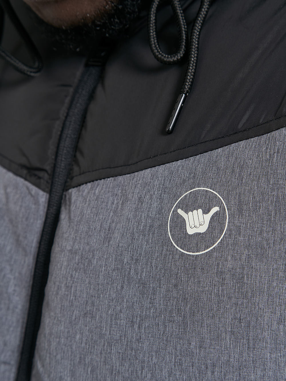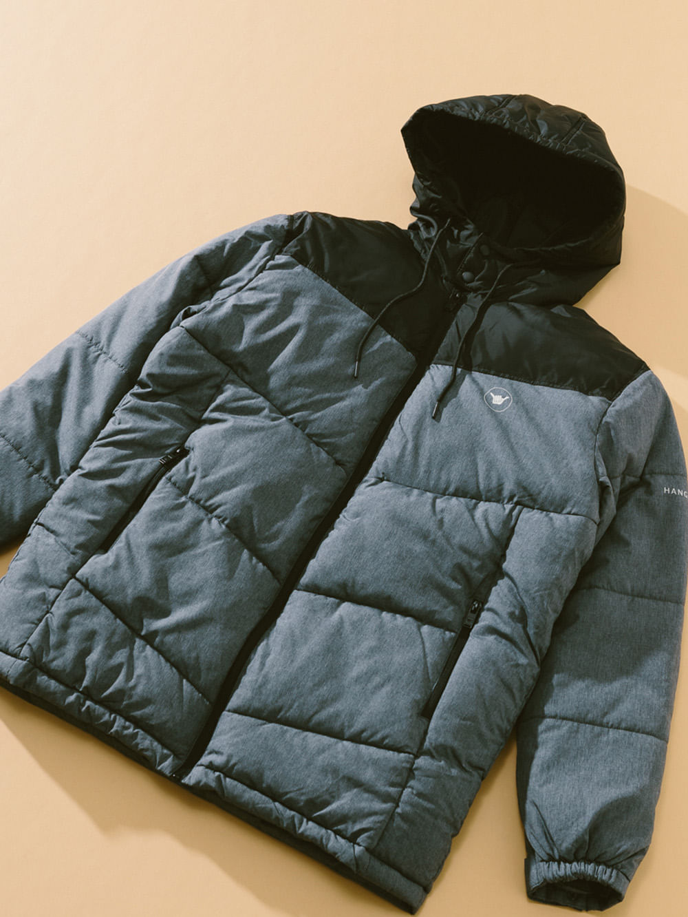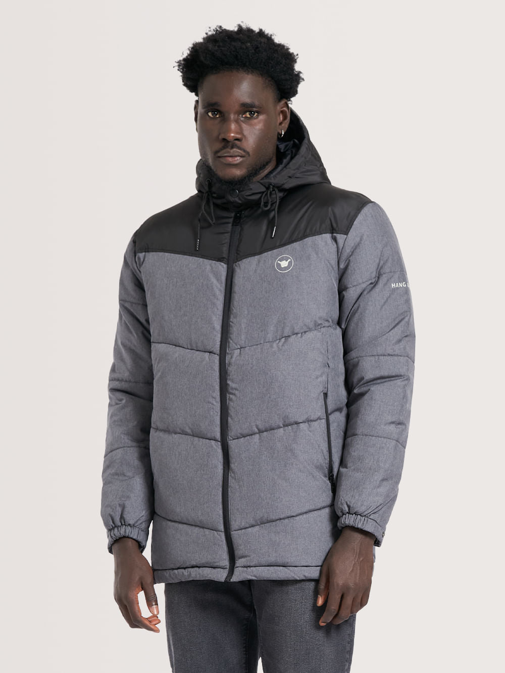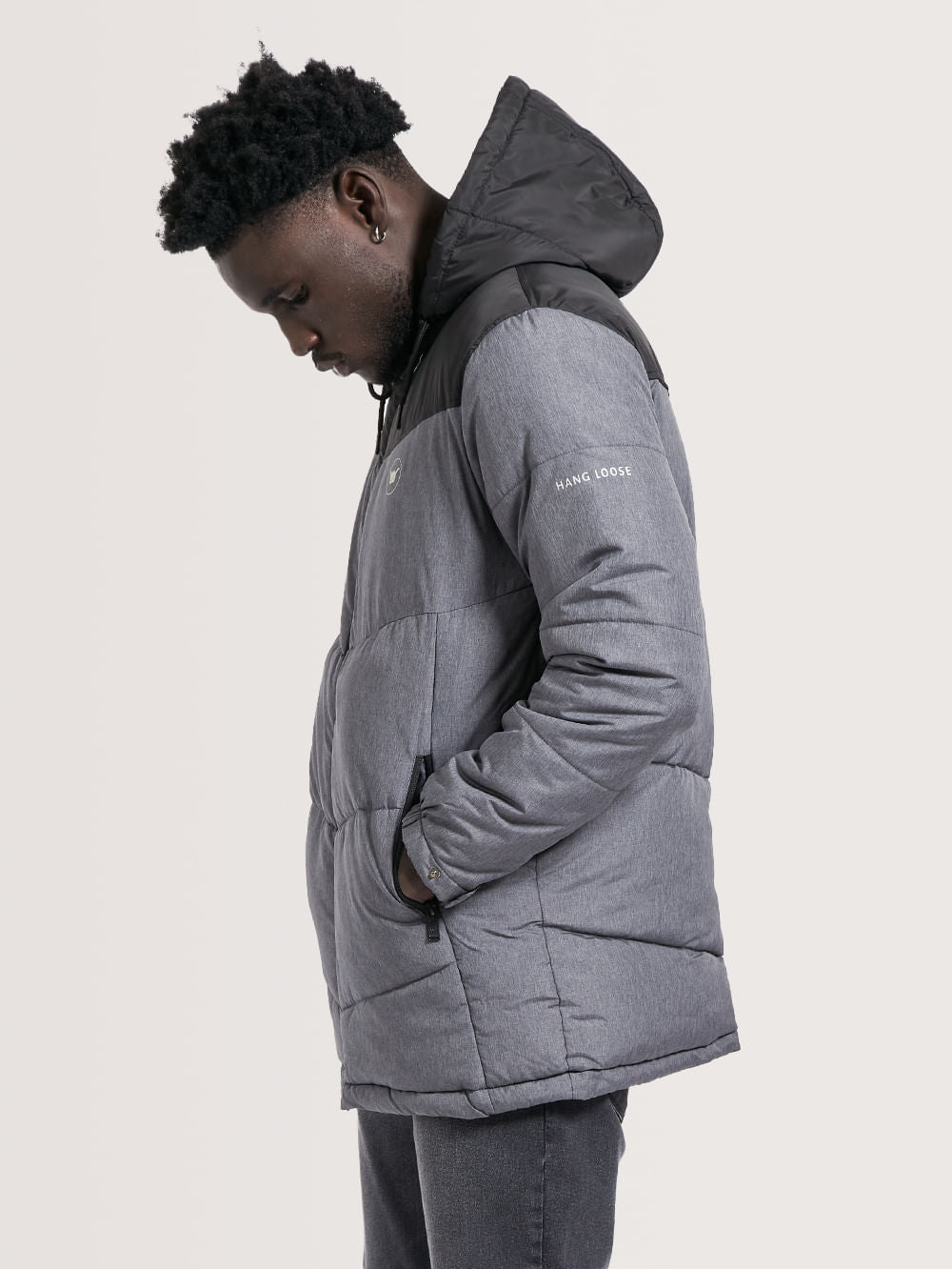 Jaqueta Hang Loose Melange, possui recorte em nylon mescla, enchimento com manta e costuras em gomos, fechamento frontal com zíper, bolsos frontais com fechamento em zíper, aplicação de etiqueta no peito e estampa em silk nas costas. Confeccionada em tecido nylon.