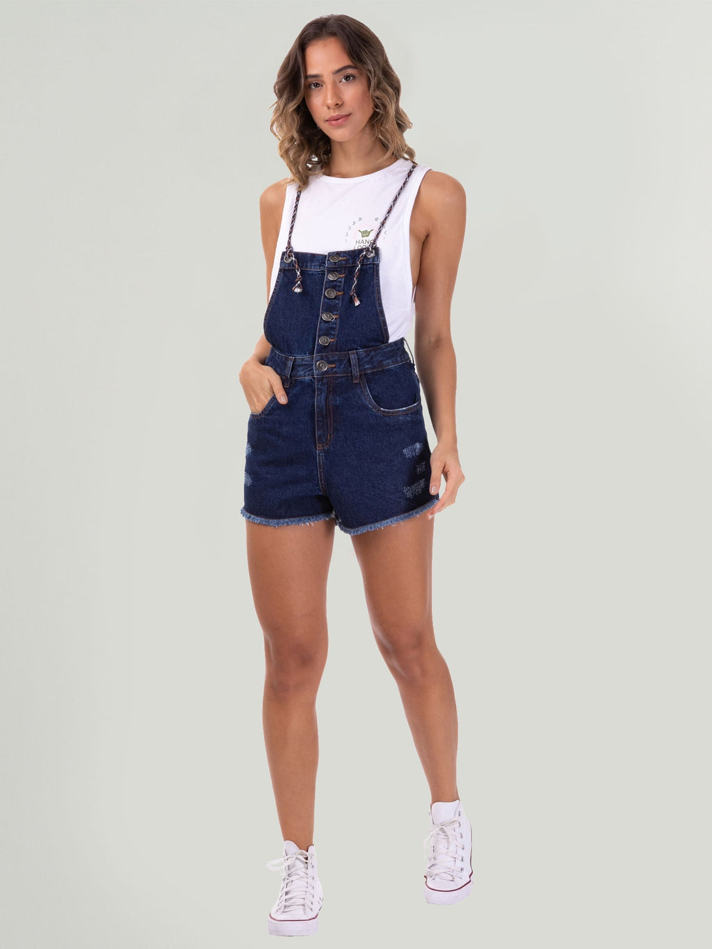 Jardineira Jeans Hang Loose Flat Azul Escuro. Confeccionado em algodão. Possui alça fina, fechamento em zíper e botão, bolsos nas laterais e traseira.