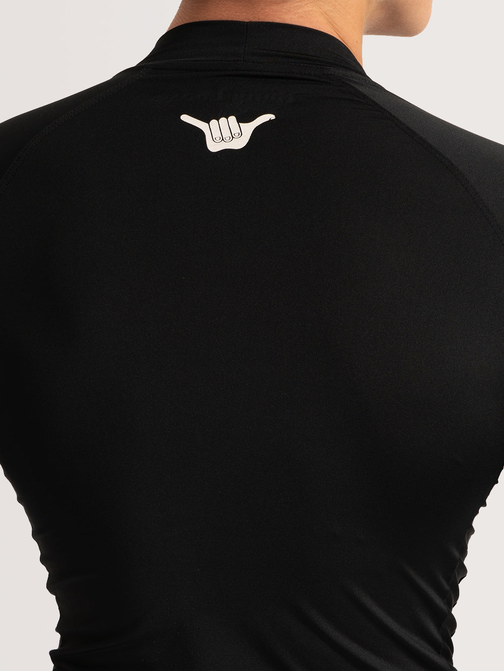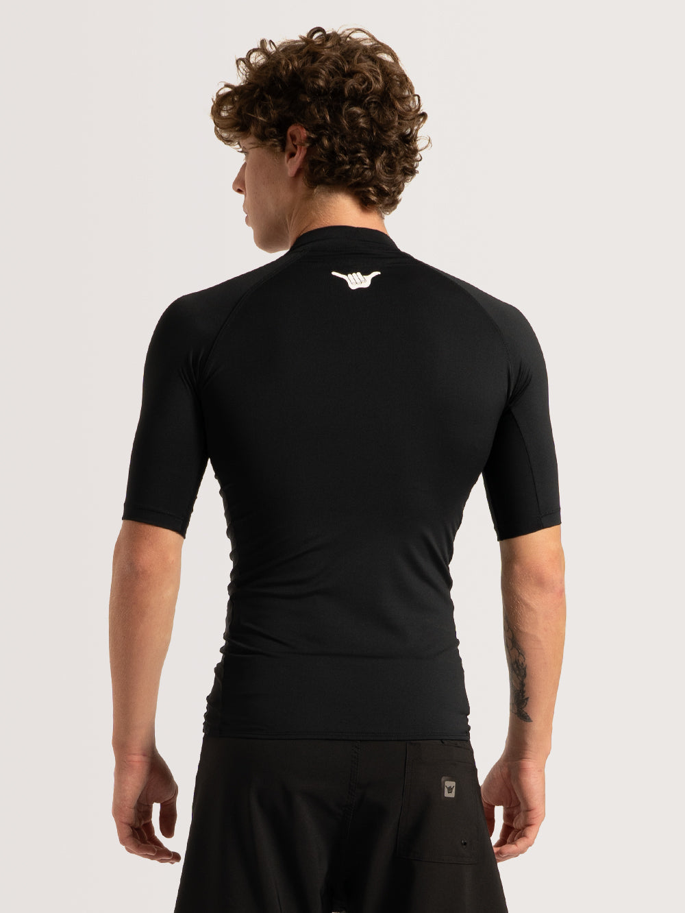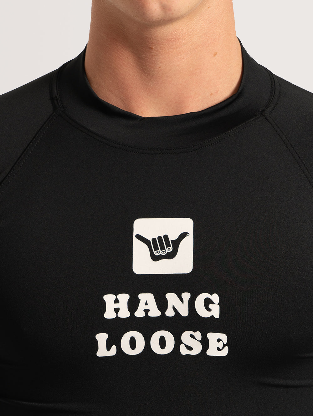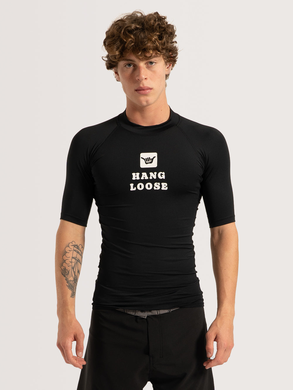 Lycra Hang Loose Boarder, possui modelagem surf, tecido malha com tratamento UV50, manga curta reglan e silk frontal e na nuca.