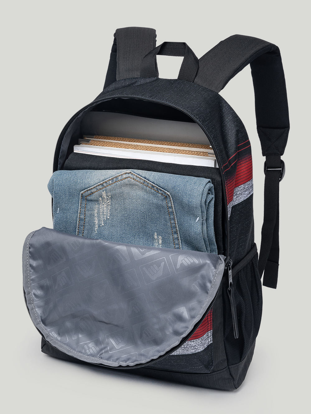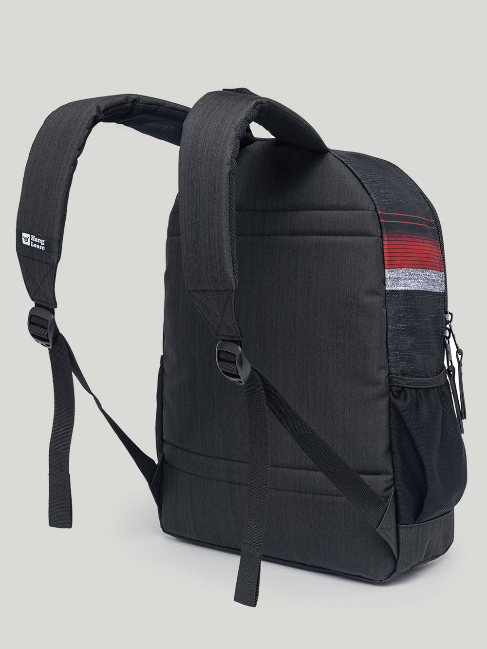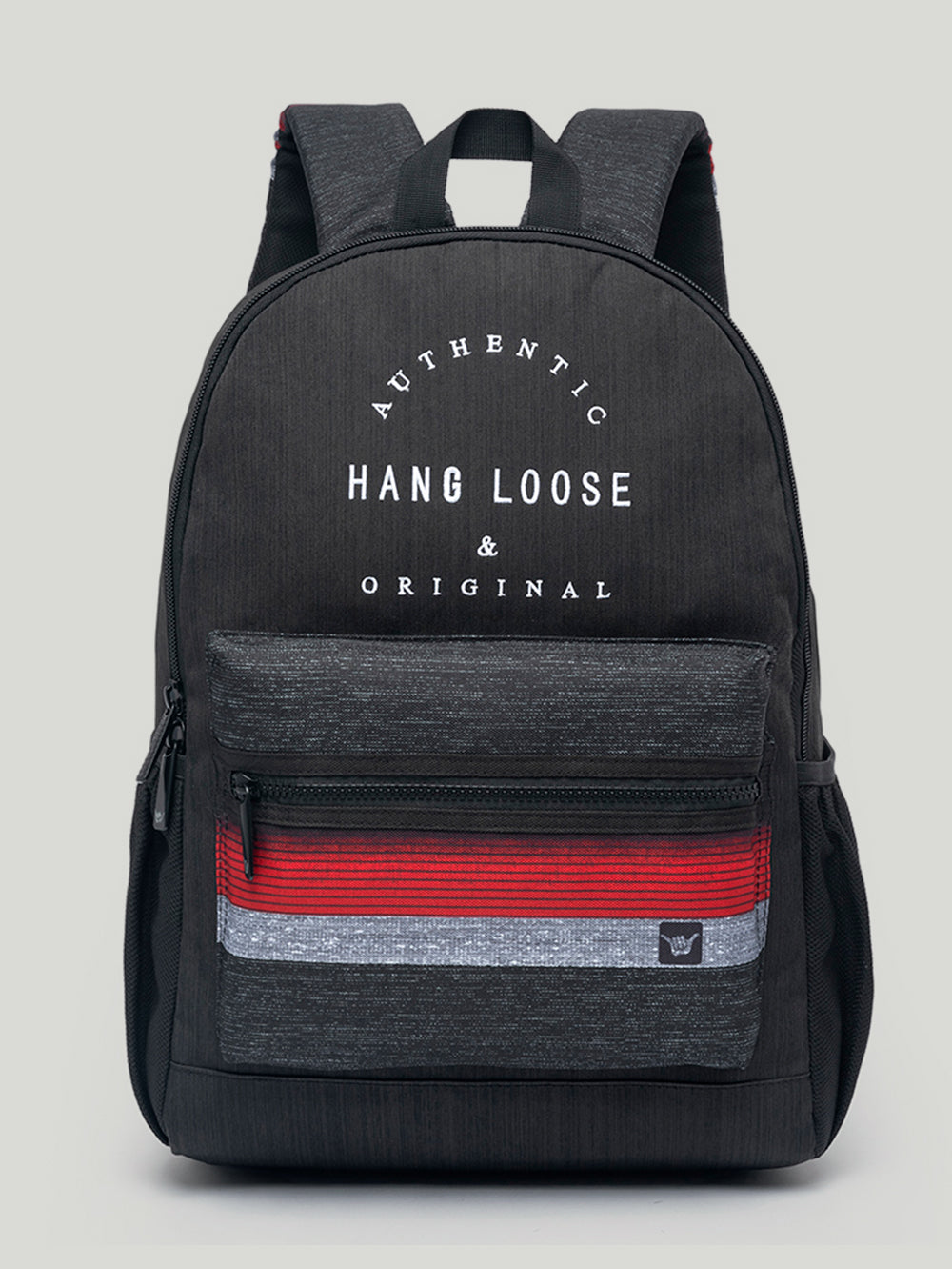 Mochila Hang Loose Canva Preta. Confeccionada em poliéster texturizado. Conta com zípers personalizados, compartilhamento para notebook até 15,5 polegadas, estampa Hang Loose frontal, aplicação de etiquetas e múltiplos bolsos. Possui 42 cm de altura, 30 cm de largura e 20 cm de profundidade, com capacidade de 25 litros. + Capacidade 25 litros + Zípers personalizados + Compartimento para notebook + Múltipos bolsos