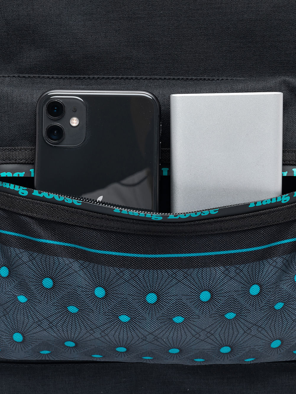 Mochila Hang Loose Mistic Preta. Confeccionada em poliéster texturizado. Conta com zípers personalizados, compartilhamento para notebook até 15,5 polegadas, estampa Hang Loose frontal e nas alças, aplicação de etiquetas e múltiplos bolsos. Possui 43 cm de altura, 30 cm de largura e 15 cm de profundidade, com capacidade de 19,5 litros.