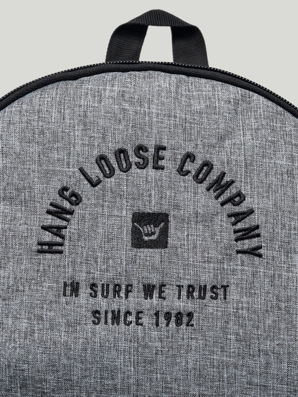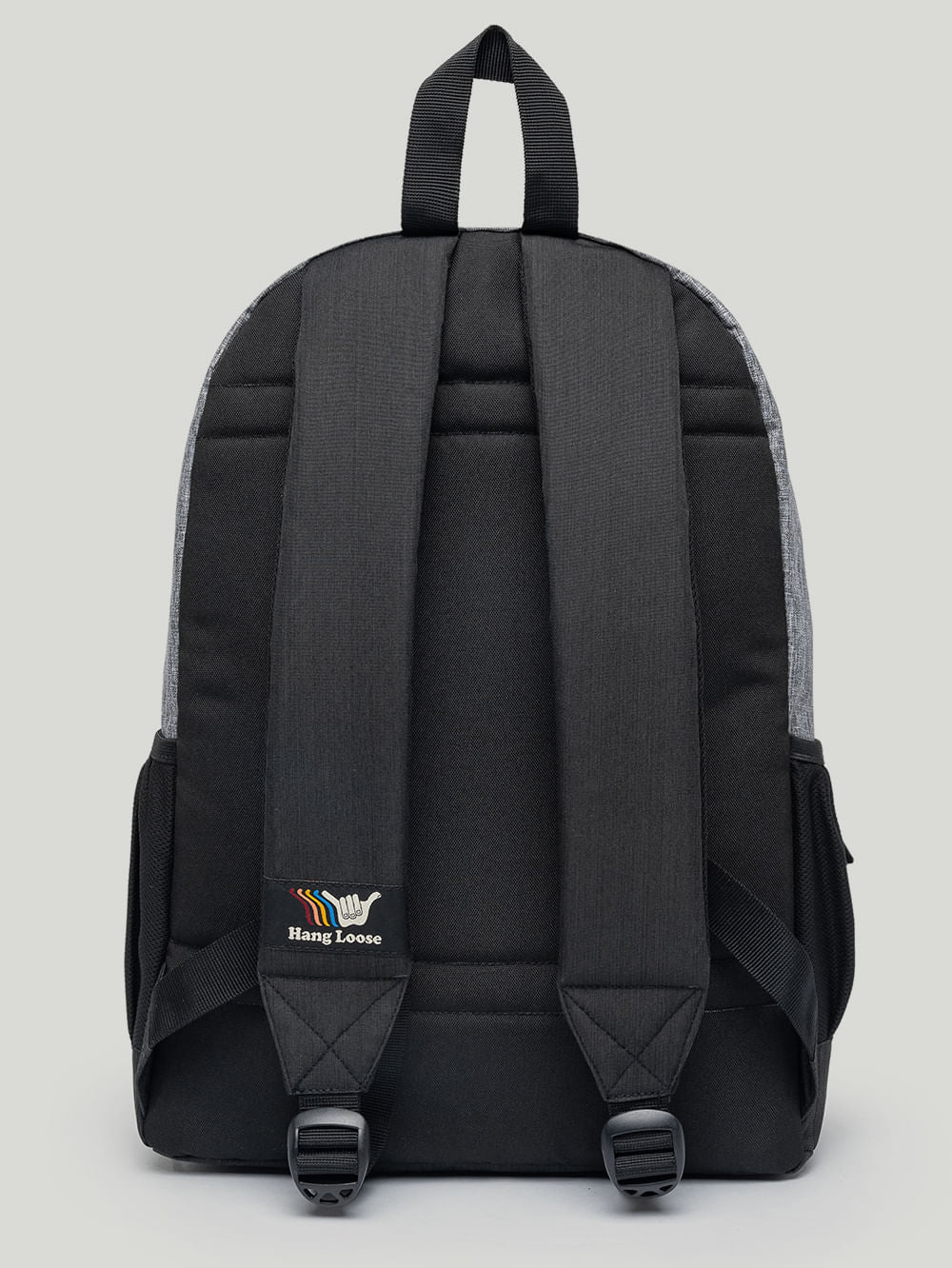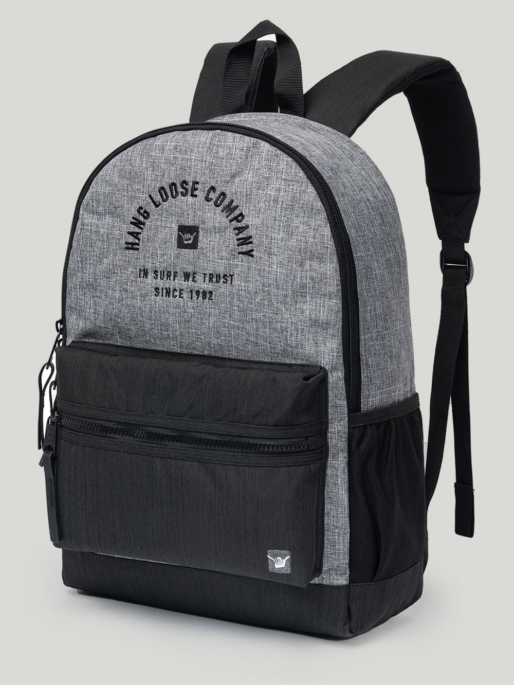 A mochila Hang Loose Line Cinza é reforçada, confeccionada em algodão. Conta com zípers personalizados, compartilhamento para notebook até 16 polegadas, estampa Hang Loose frontal, aplicação de etiquetas e múltiplos bolsos. Possui 45 cm de altura, 31 cm de largura e 15 cm de profundidade, com capacidade de 21 litros.
