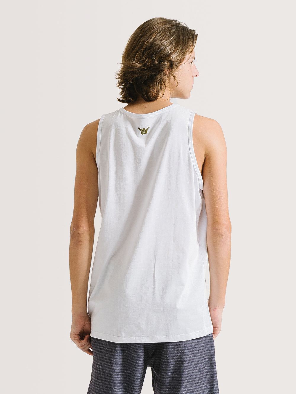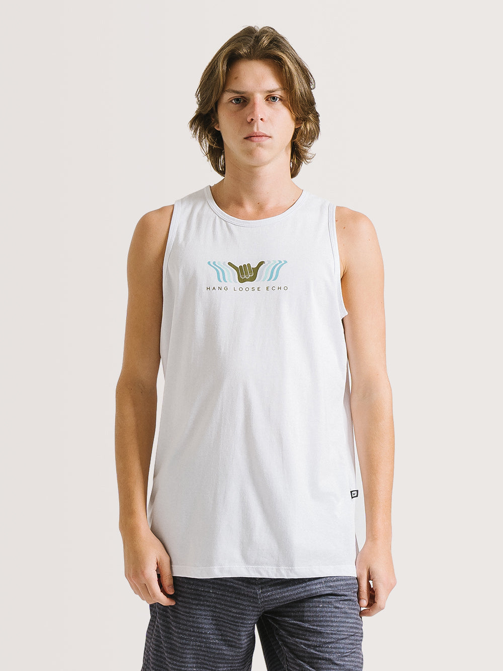 Regata Hang Loose Echo, possui estampa em silk frontal e na nuca e etiqueta Hang Loose na lateral. Confeccionada em tecido meia malha 30/1.