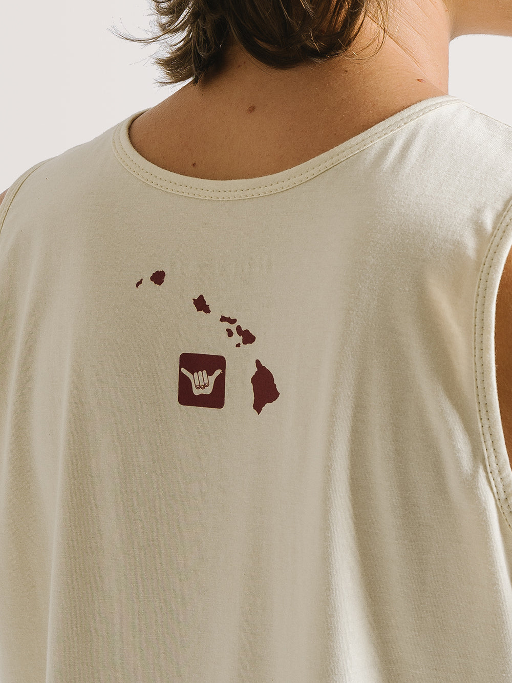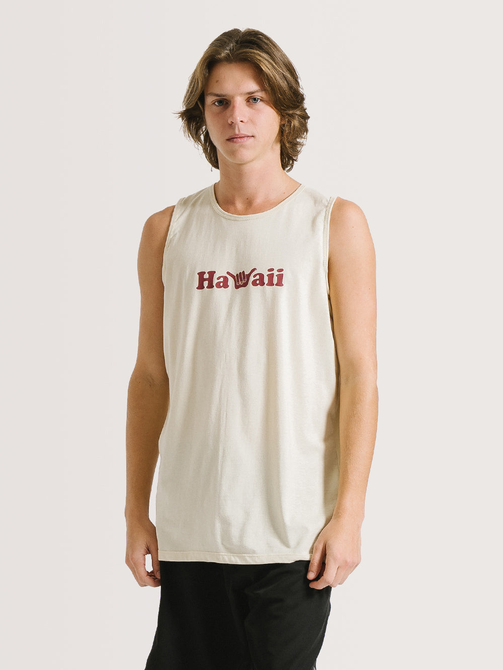 Regata Hang Loose Hawaii, possui estampa em silk frontal e na nuca e etiqueta Hang Loose na lateral. Confeccionada em tecido meia malha 30/1.
