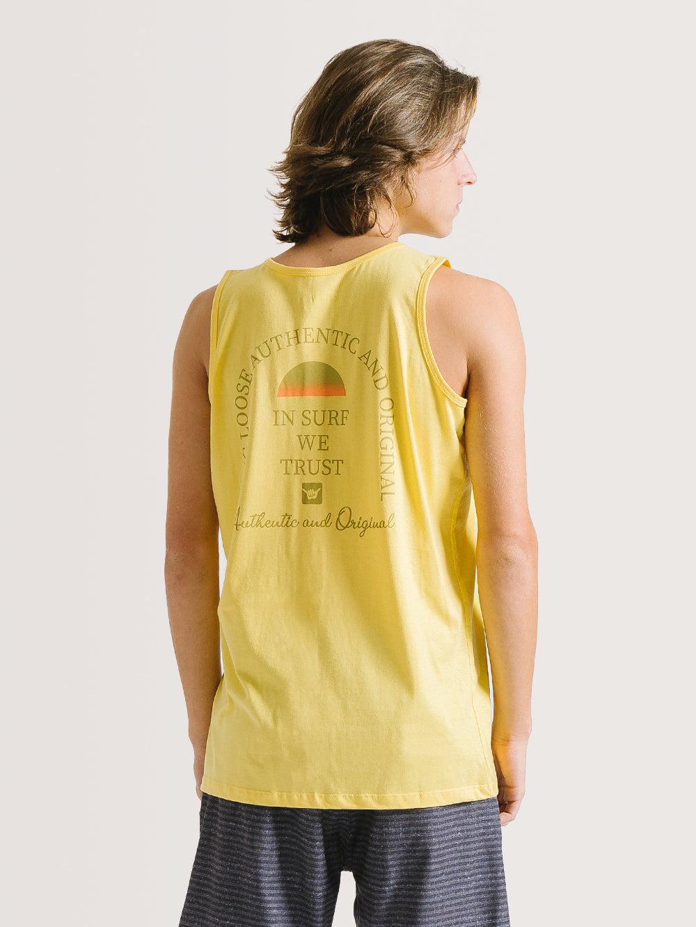 Regata Hang Loose Sunshine, possui estampa em silk frontal e nas costas e etiqueta Hang Loose na lateral. Confeccionada em tecido meia malha 30/1.